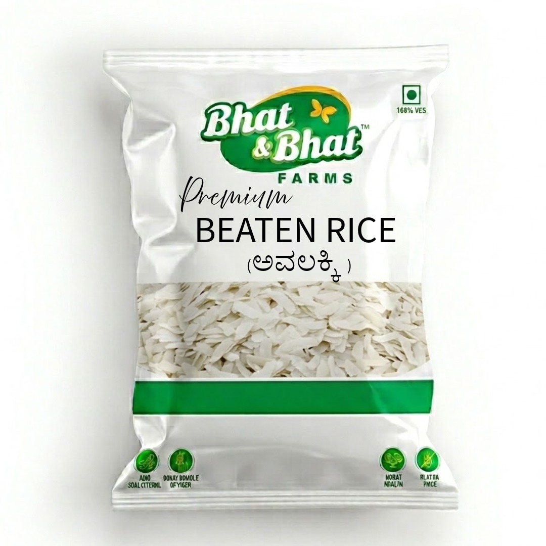 Savor the light and wholesome goodness of Bhat & Bhat Farms Premium Beaten Rice (Avalakki). Made from the finest quality paddy, our flattened rice is processed to perfection to ensure it remains fluffy after soaking. A 100% natural, quick-cooking breakfast staple that is easy on the stomach and rich in iron.